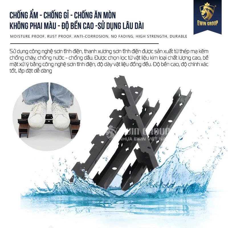 Trong hệ trần nhựa hoặc trần nhôm, thanh xương treo nan trần U là bộ phận giữ vai trò cực kỳ quan trọng, quyết định đến độ chắc chắn, thẩm mỹ và tuổi thọ của toàn bộ công trình. Dòng sản phẩm thanh xương U EWIN được sản xuất từ thép U dày dặn, sơn tĩnh điện đen cao cấp, giúp tăng khả năng chịu lực, chống gỉ sét và đảm bảo độ bền lên tới 15 – 20 năm trong điều kiện sử dụng thực tế.